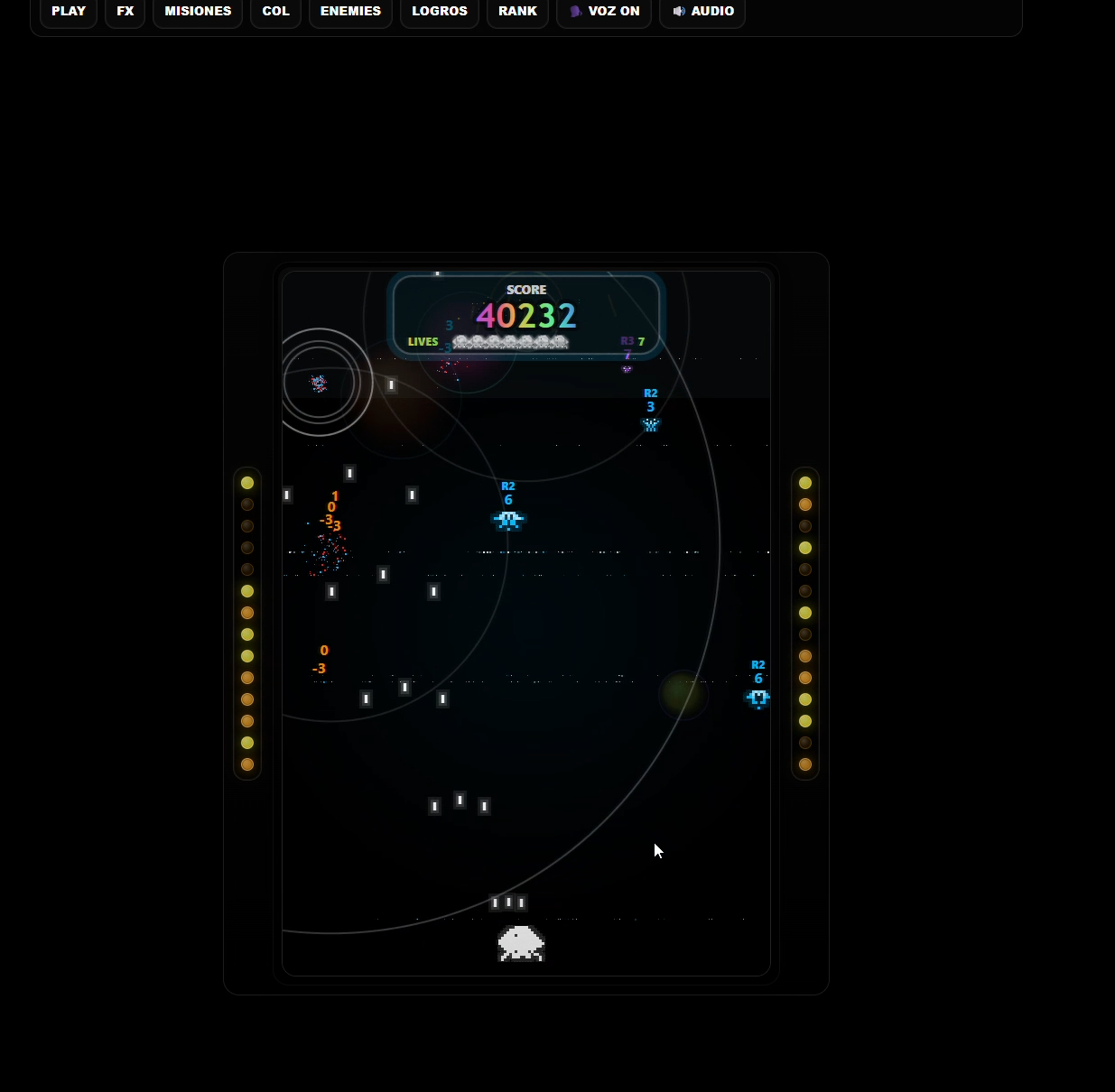 🎚️😈😇 🏆 Score animado estilo recreativa El marcador no es estático: cuando sumas puntos hace pop, chispas como las palomitas jeje✨, mini onda expansiva 💫 y efectos para que cada kill “se sienta”. Subir el score aquí es puro vicio. 💯🔥 💥 Explosiones y feedback brutal Explosiones con partículas, destellos y “impacto” visual Sonidos arcade y alertas robóticas 🤖🔊 HUD claro para que siempre sepas: vidas ❤️, escudo 🛡️, fase, arma, daño, cadencia y monedas. 🪙 🧩 Roguelike / Build adictivo Tras cada pantalla eliges recompensas (cartas/mejoras) y montas tu build: Armas nuevas, cadencia, daño, balas más “gordas”, disparos múltiples, etc. 🔫⚡ Rotación mejorada: menos repetición y más variedad para que no sientas “siempre lo mismo”. 🎲 A veces, al derrotar un boss, puede tocarte un bonus de vida (según eventos/azar). 🍀❤️ 🗺️